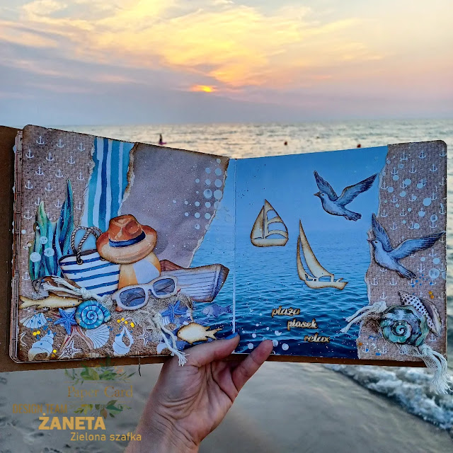 Idealnym pomysłem na pamiątkę z wakacji będzie wpis do Art Journala. Wspomnienie miłych chwil spędzonych w rewelacyjnym towarzystwie utrwalone za pomocą papieru i, oczywiście odpowiednich tekturek. W nadmorski klimat wprowadzą nas rybki, statki i odpowiednie napisy.